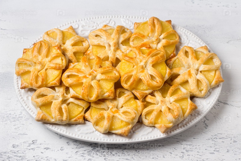 Запеченные ананасы в слоеном тесте на светлом серо-голубом фоне, вид сверху. Вкусные домашние слойки
