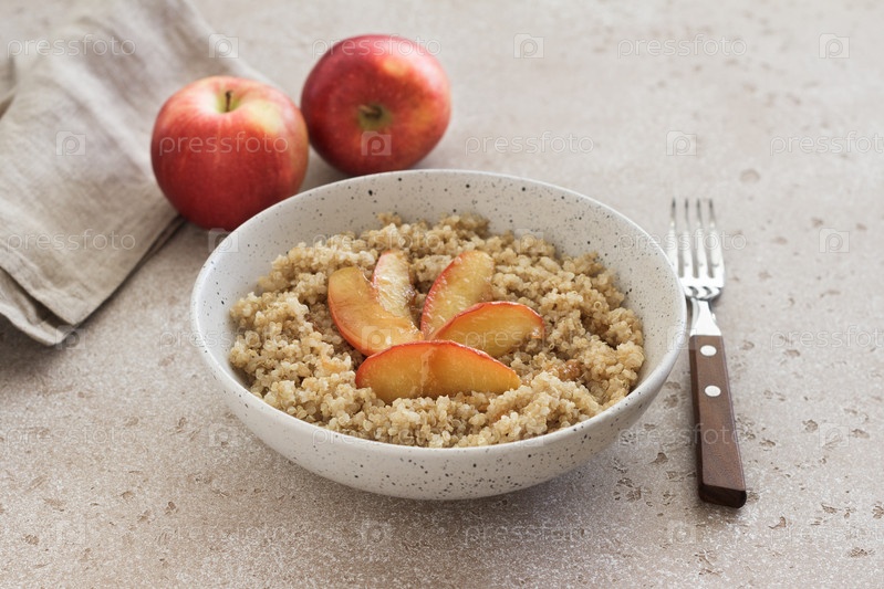 Киноа с карамелизированным ломтиком яблока на бежевом текстурированном фоне. Веганское полезное блюдо