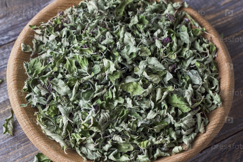 Сушеные листья орегано в деревянной миске на деревянном столе, вид сверху, крупный план