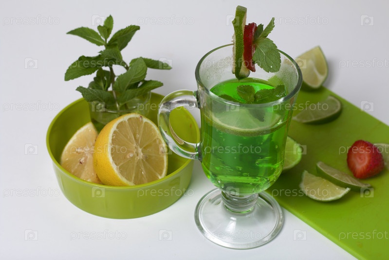Зеленый лимонад в стакане. Украшен лаймом и клубникой. С веточками мяты. Рядом с лимоном и мятой