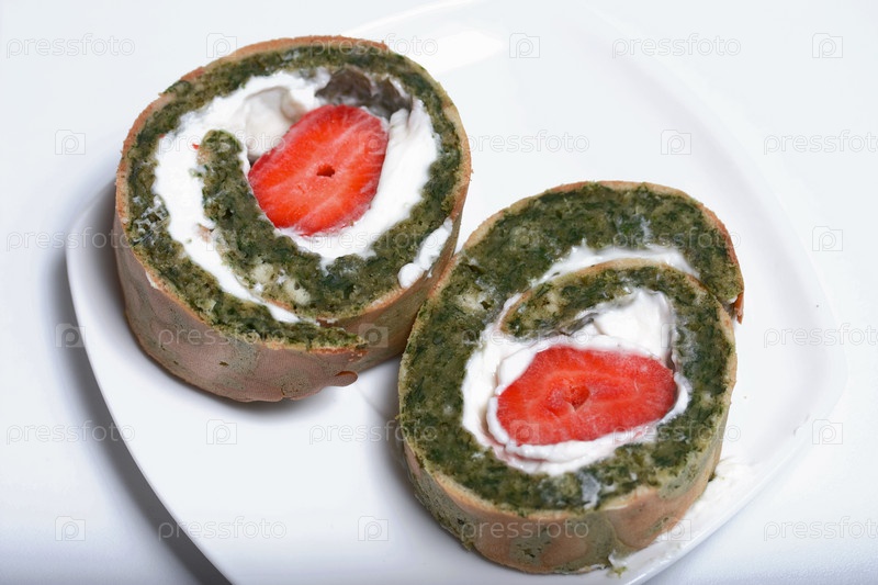 Рулет из шпината и мяты с клубничной начинкой. Виден разрез рулета