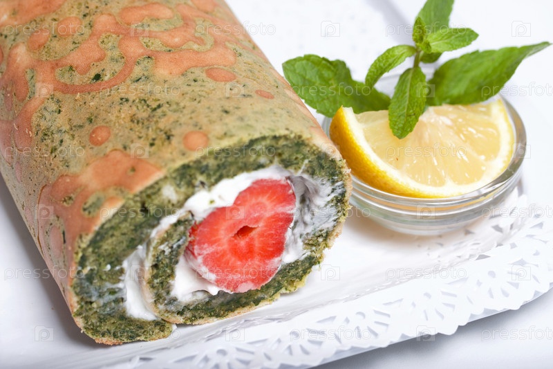 Рулет из шпината и мяты с клубничной начинкой. Виден разрез рулета. Рядом лимон и мята