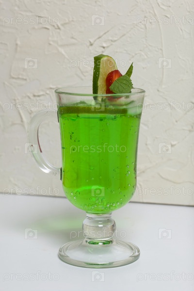 Зеленый лимонад в стакане. Украшен лаймом и клубникой. С веточками мяты