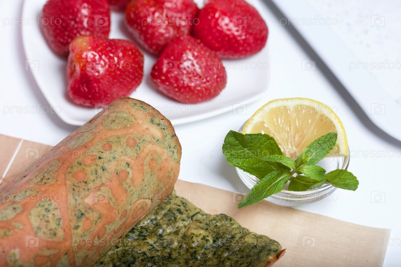Подготовка к приготовлению бисквитного рулета со шпинатом и мятой. С начинкой из клубники. Ингредиенты для приготовления
