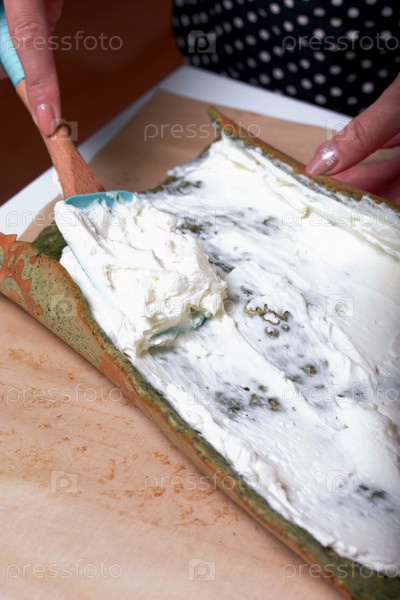 Женщина наносит крем на торт, чтобы приготовить бисквитный рулет со шпинатом и мятой. С начинкой из клубники. Ингредиенты для приготовления