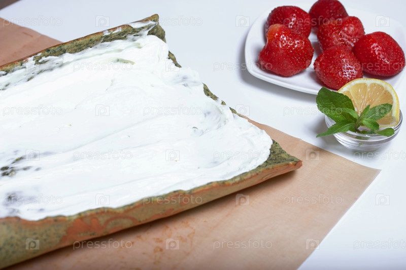 Крем на корж для приготовления бисквитного рулета со шпинатом и мятой. С начинкой из клубники. Ингредиенты для приготовления