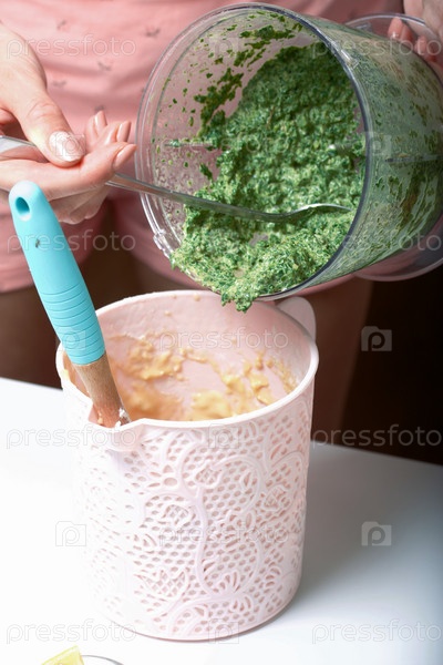 Женщина добавляет в тесто измельченный шпинат и мяту. Для приготовления бисквитного рулета со шпинатом и мятой. С начинкой из клубники. Ингредиенты для приготовления