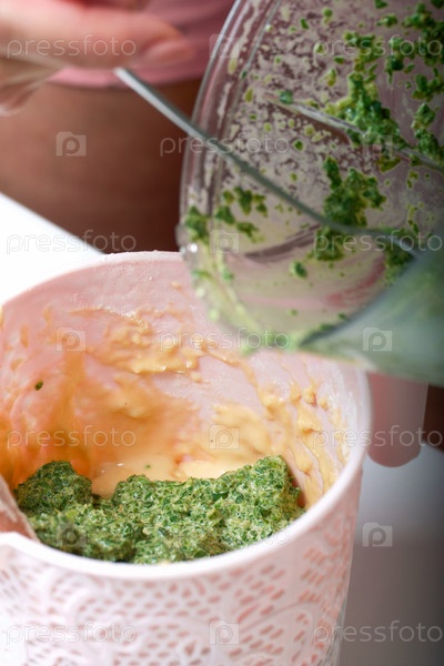 Женщина добавляет в тесто измельченный шпинат и мяту. Для приготовления бисквитного рулета со шпинатом и мятой. С начинкой из клубники. Ингредиенты для приготовления
