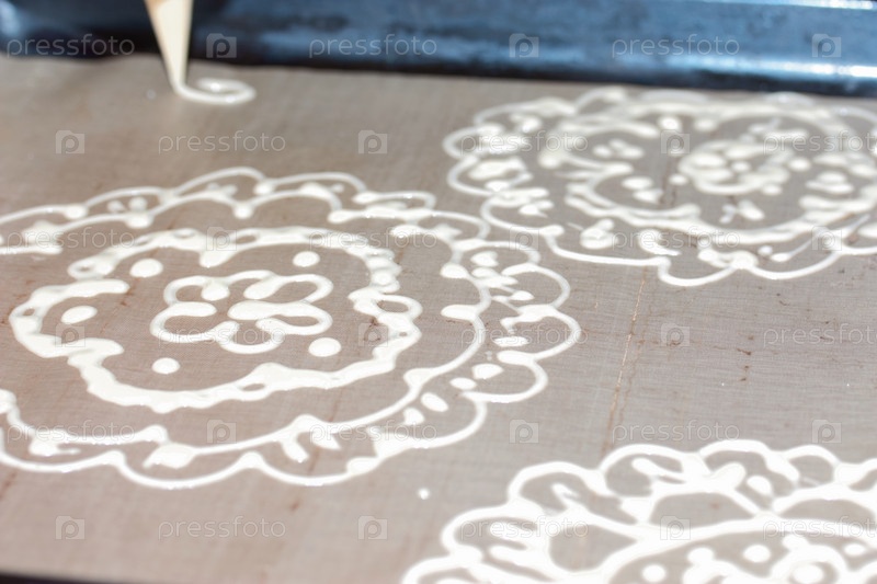 Женщина делает узор из теста на противне. Для приготовления бисквитного рулета со шпинатом и мятой. С начинкой из клубники. Ингредиенты для приготовления