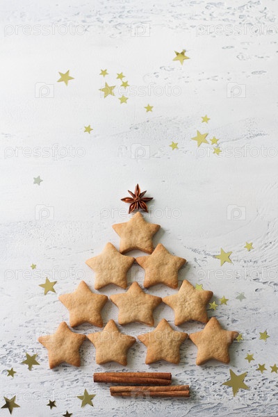 Новогодняя елка из домашних пряников в форме звезд на светло-голубом фоне, вид сверху