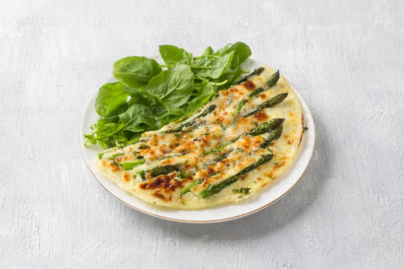 Вкусный омлет со спаржей и сыром на белой тарелке на светло-сером фоне, вид сверху. Домашняя вегетарианская еда