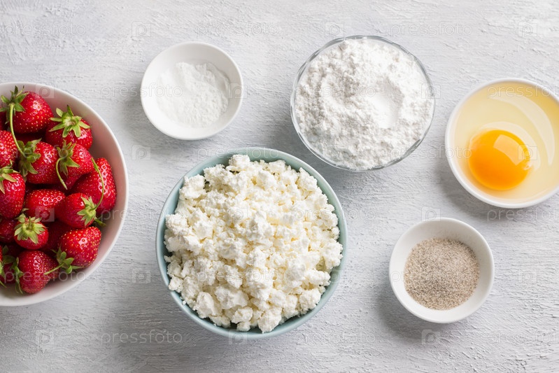 Ингредиенты для домашних творожных ньокки с клубничным соусом: творог, клубника, рисовая мука, яйцо, сахар, ванильный сахар, разрыхлитель на светло-сером фоне