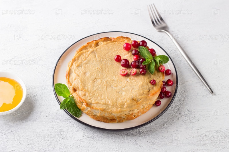 Домашняя полезная низкокалорийная творожная запеканка с яблоком, подается со свежей клюквой, мятой, медом и сметаной на светло-сером фоне