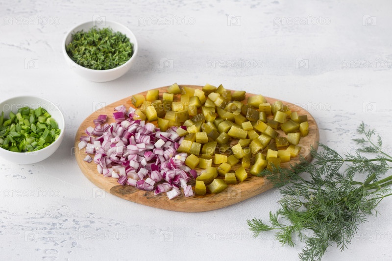 Деревянная доска с нарезанным красным луком, солеными огурцами и пучком укропа на светло-голубом фоне. Приготовление домашней еды