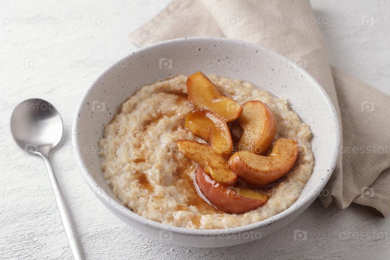 Сладкая овсяная каша с печеными кусочками яблок, корицей и карамельным соусом в серой миске на светлом фоне, вид сверху. Вкусная домашняя еда