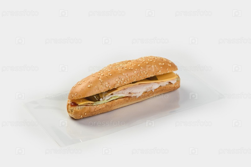 Багет, фаршированный курицей, овощами и сыром на сером фоне