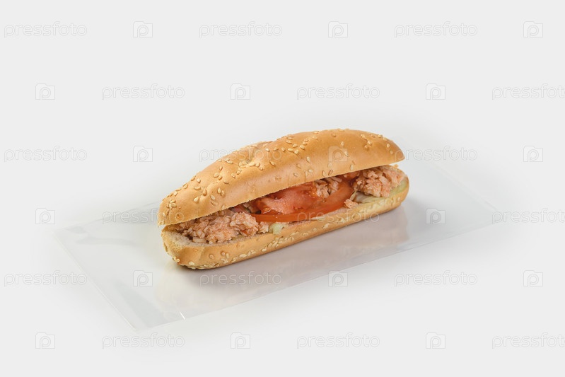 Багет с рубленой курицей, помидорами и зеленью на светлом фоне