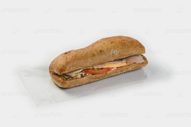 Ржаная чиабатта с ветчиной, помидорами, сыром и зеленью на светло-сером фоне