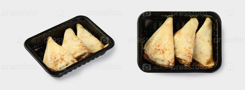 Блины с начинкой в черном пластиковом контейнере на белом фоне для службы доставки еды