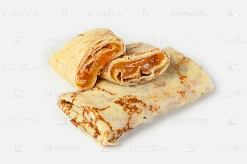 Блины с апельсиновым джемом. Один блин показан в разделе с начинкой. Светлый фон с тенью. Концепция доставки еды