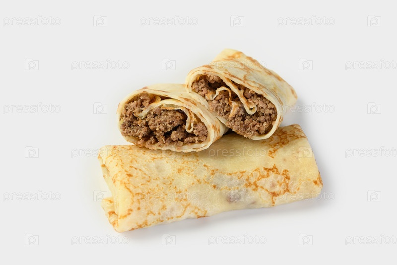 Пикантные блинные рулетики с начинкой из мясного фарша. Белый фон, пространство для копирования. Один блин показан в секции с начинкой. Концепция услуг доставки еды