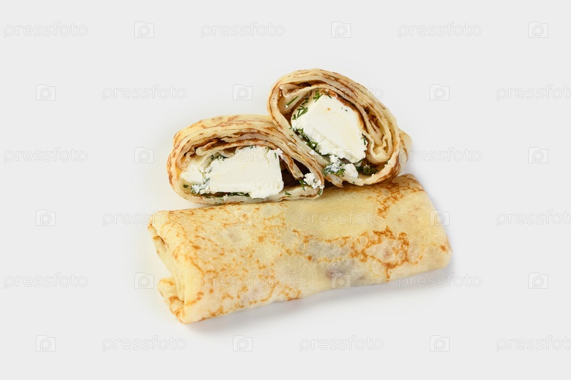 Блинчики-рулетики с сырным кремом и зеленью. Один блинчик разрезается пополам, чтобы показать начинку. еда для службы доставки