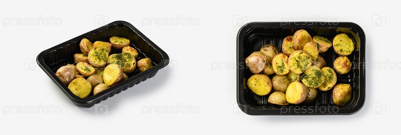 Картофельные дольки, запеченные в кожуре. Золотистые и хрустящие. в контейнере службы доставки еды