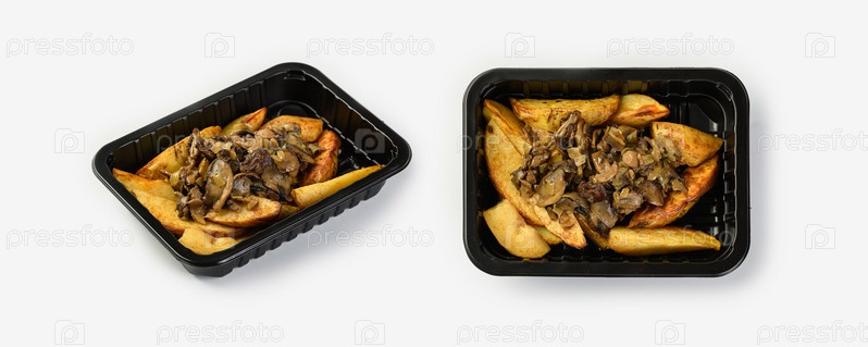 Жареный картофель с грибами на белом фоне в контейнере для службы доставки