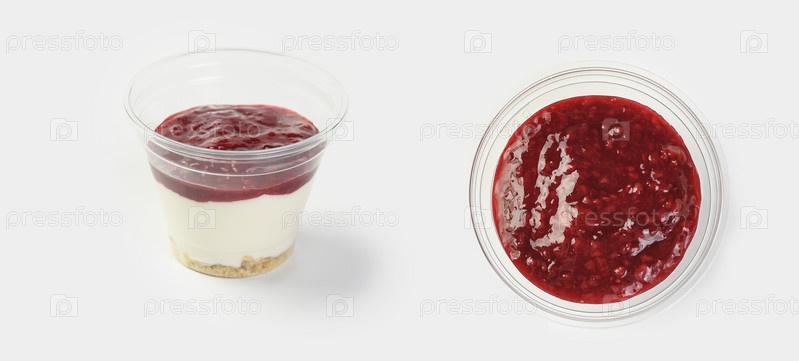 Йогурт с малиновым джемом на белом фоне в контейнере для службы доставки еды