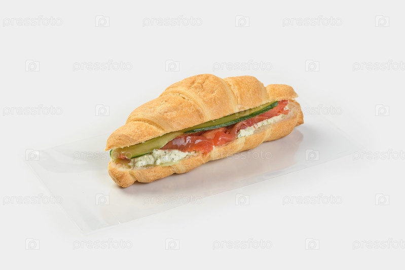 Круассан-сэндвич с огурцом и лососем на светло-сером фоне с тенью
