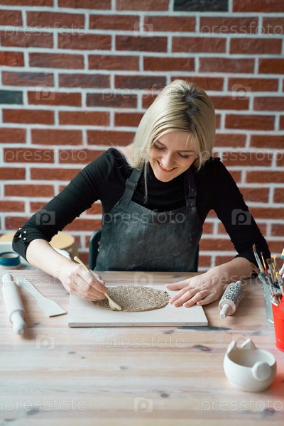 Счастливая улыбающаяся женщина делает керамическую тарелку, кран со шпателем. Концепция для женщины в фрилансе, бизнес. Изделие ручной работы. Зарабатывайте дополнительные деньги, подработка, превращая хобби в деньги, страсть в работу