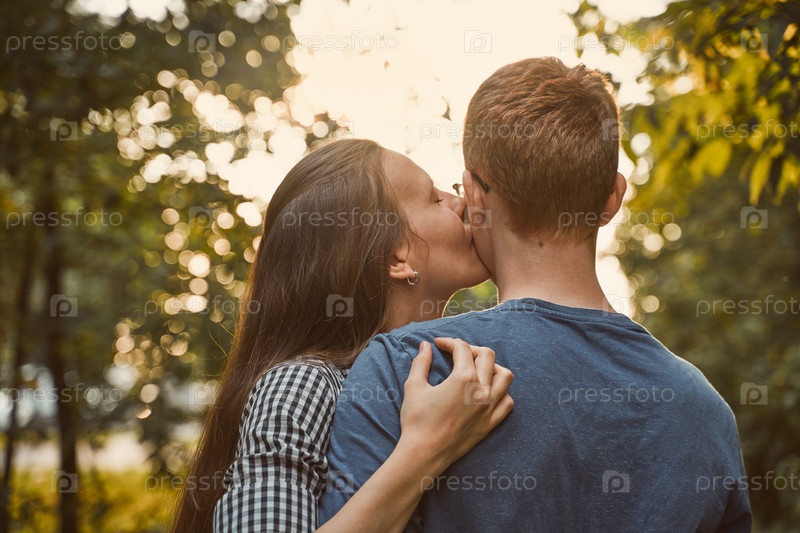 Девушка целует парня в щеку в парке, концепция подростковой любви