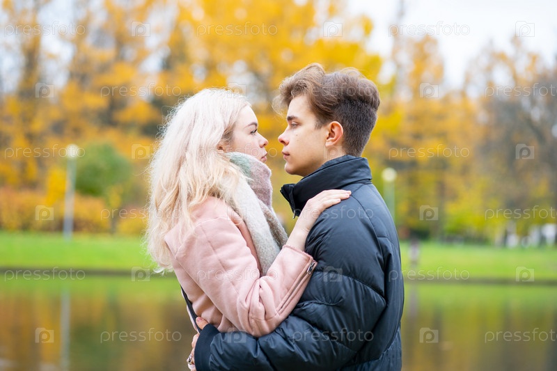 Концепция подростковой любви. Симпатичный брюнет парень фтв молодая блондинка девушка