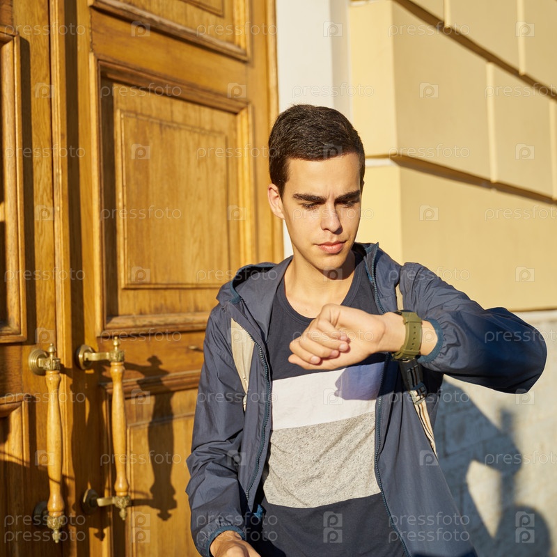 Молодой взрослый смотрит на часы. Напряженный кавказский мужчина с черными волосами боится опоздать. Девушка опаздывает на свидание