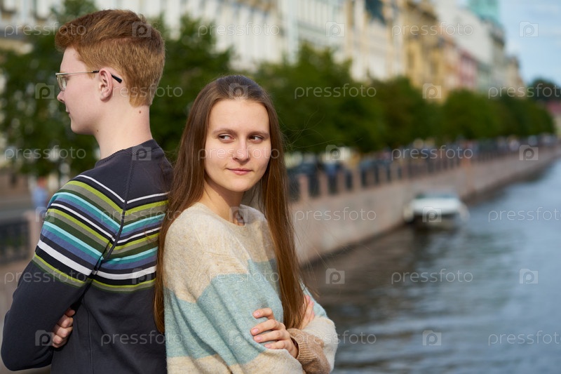 Портрет счастливой пары, стоящей спиной к спине в центре города, рыжеволосый мужчина в очках, красивая женщина с длинными темными волосами