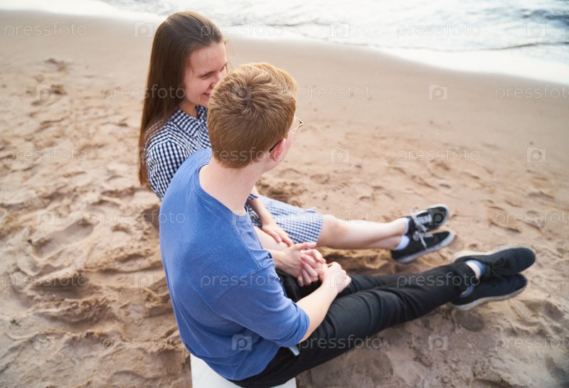 Девушка и парень общаются, пляжный фон, концепция подростковой любви