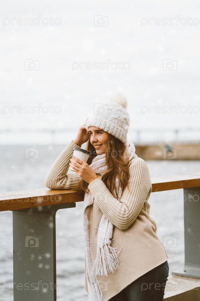 Красивая молодая девушка пьет кофе, чай из пластиковой кружки. Зима, канун Рождества, канун Нового года. Женщина с длинными волосами готовится к путешествию, скандинавский стиль