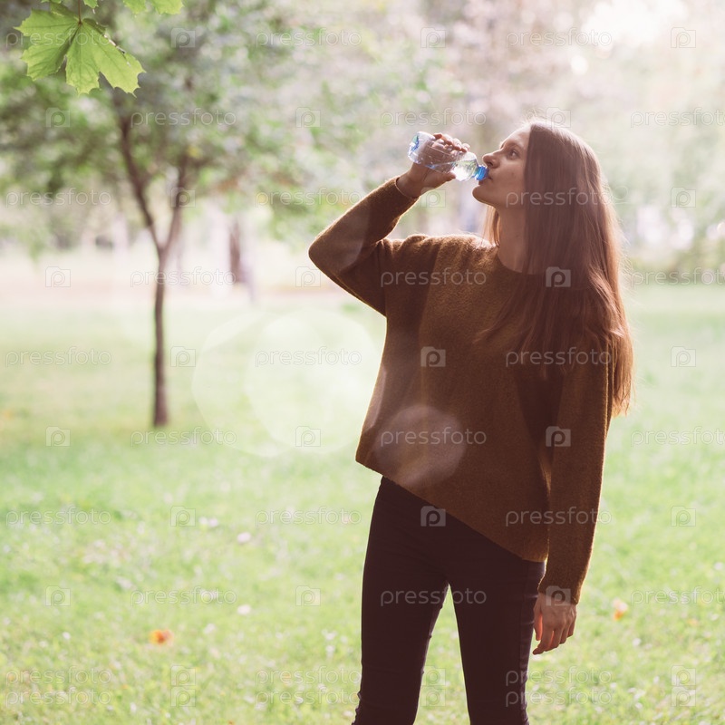 Молодая красивая девушка пьет воду из пластиковой бутылки на улице в парке осенью или зимой. Женщина с красивыми длинными густыми темными волосами утоляет жажду воды на прогулке