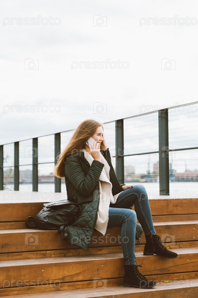 Красивая женщина с длинными волосами разговаривает по телефону. Осень или зима, девушка в куртке сидит на деревянных ступеньках