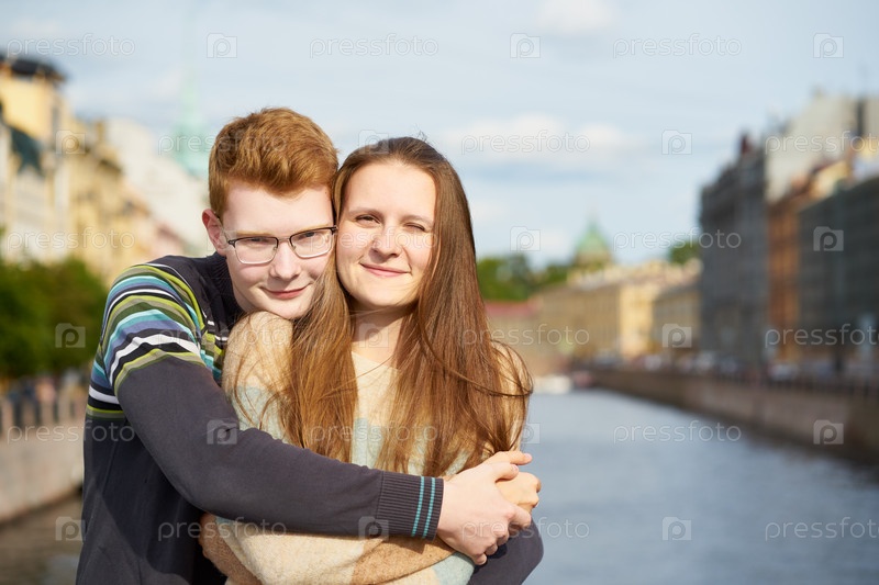 Портрет счастливой пары, обнимающейся в центре города, рыжеволосый мужчина в очках, женщина с длинными волосами, смотрящая прямо