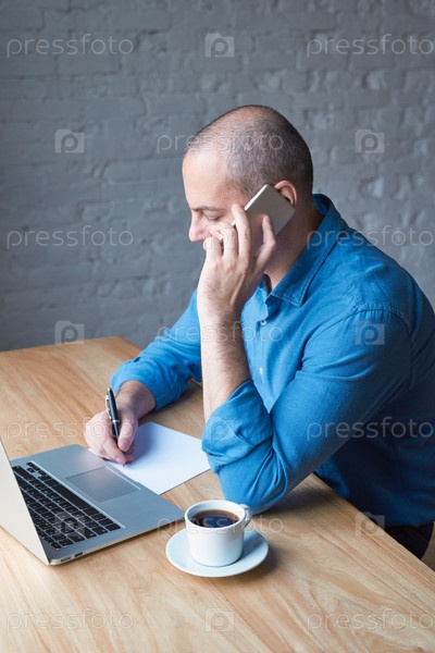 Красивый красивый зрелый мужчина пишет на листе бумаги и разговаривает по мобильному телефону, сидит за компьютером, ноутбуком. Мужчина в повседневной одежде в синей рубашке за столом в офисе перед окном