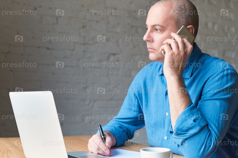 Красивый красивый зрелый мужчина смотрит в окно и разговаривает по мобильному телефону, сидя за компьютером, ноутбуком. Мужчина в повседневной одежде в синей рубашке и стол в офисе перед окном, копировальное пространство