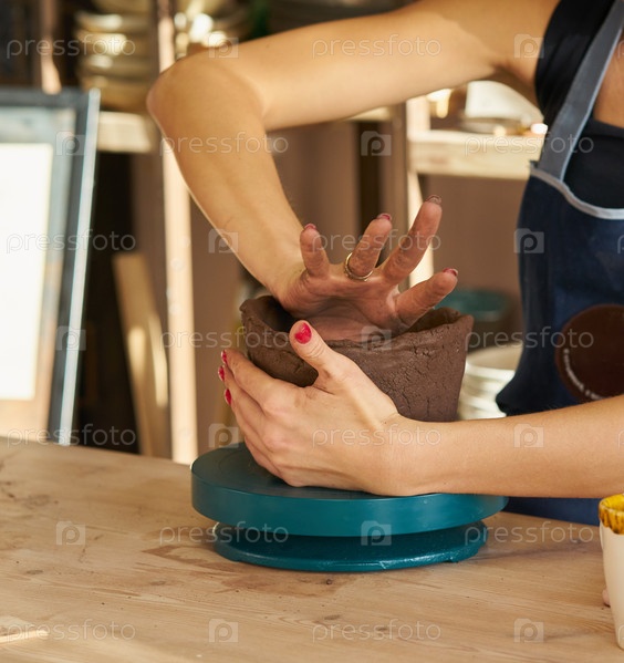 Женщина изготавливает керамическую посуду, руки крупным планом, фокус на гончарах, ладони с глиняной посудой