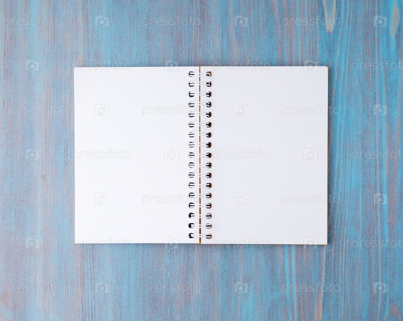Открытый блокнот на пружине с белой бумагой для заметок и рисования. Светлый фон, синее дерево, вид сверху