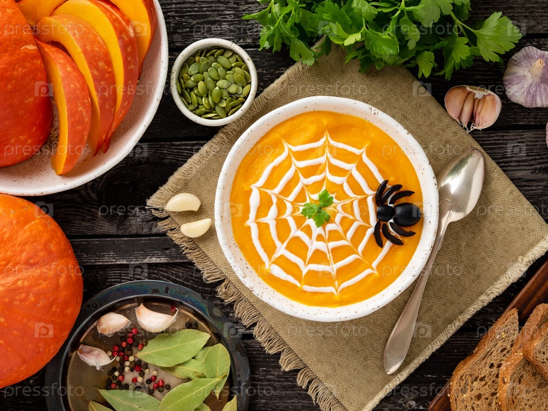 Смешная еда на Хэллоуин. Тыквенный суп-пюре, паутина, темный старый деревянный стол, вид сверху