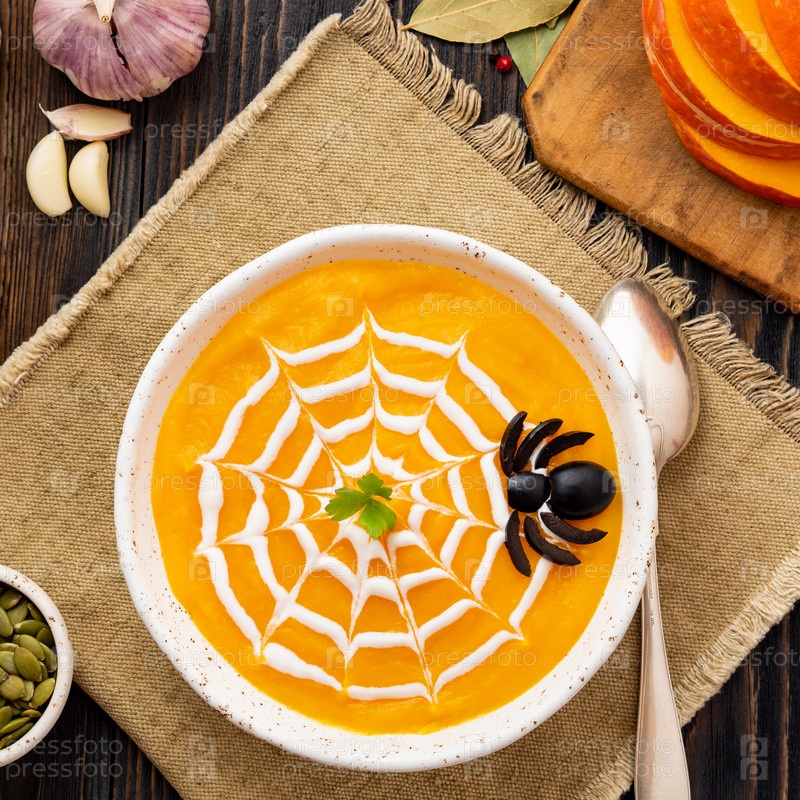 Смешная еда на Хэллоуин. Тыквенный суп-пюре, паутина, темный старый деревянный стол, вид сверху