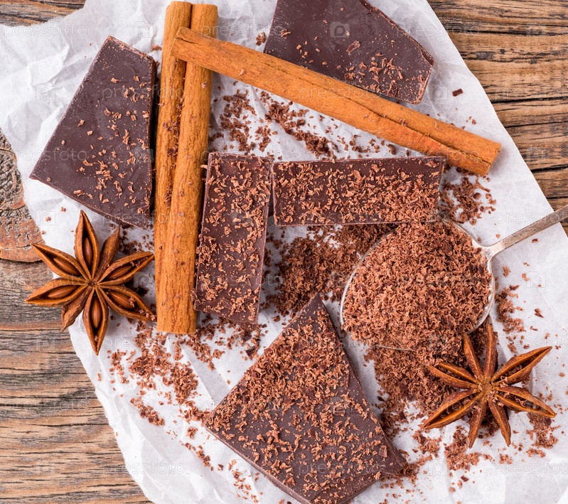 Кусочки шоколада, анисовая звезда, палочки корицы, крошка на пергаментной бумаге, вид сверху