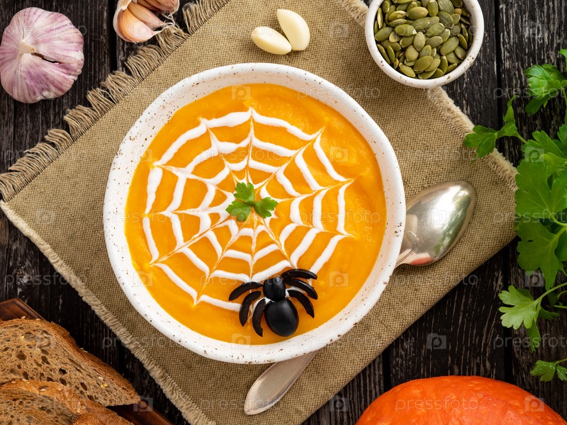Смешная еда на Хэллоуин. Тыквенный суп-пюре, паутина, темный старый деревянный стол, вид сверху