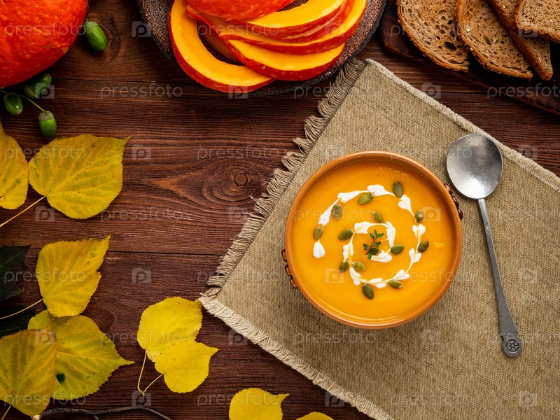 Осенняя еда. Суп-пюре из тыквы, листья, темно-коричневый старый деревянный стол, вид сверху, место для копирования