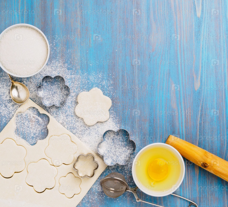 Сырое слоеное тесто лежит на синем деревянном столе, посыпанном мукой. Фигурки для выпечки вырезаны из металлической формы, сахар и яйцо в мисках